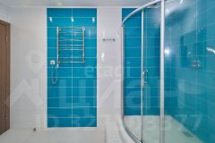 Отделка кафелем жизнерадостного бело-бирюзового цвета.