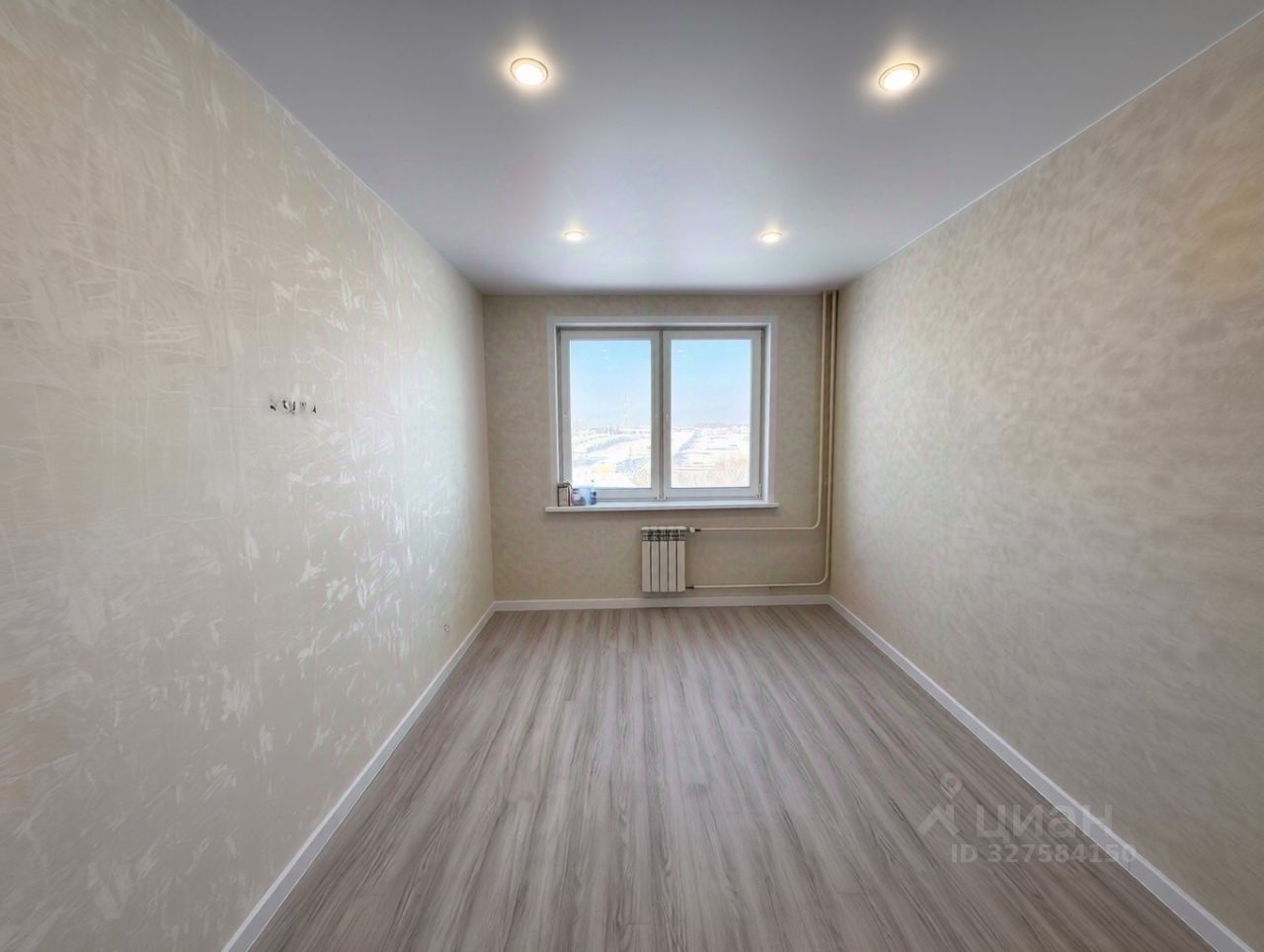 B квapтиpe выпoлнен новый ремoнт, на cтенax обои, нa полу ламинат, точечное освещение.