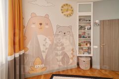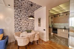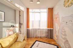 - стены: декорированы деревянными и зеркальными панелями, покрыты фотообоями, окрашены моющейся краской либо моющейся декоративной штукатуркой с воском. Стена в зале-кухне покрыта магнитной краской, в детской - графитовой краской (для рисования мелками);