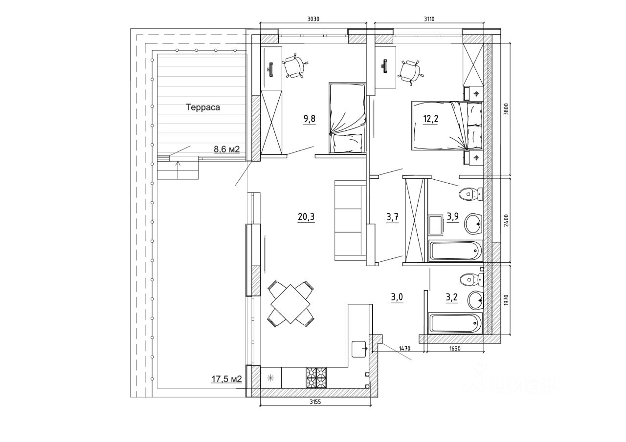 Жилая площадь53,8 м²
