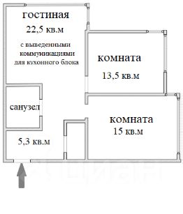Изолированные комнаты - 15кв.м. и 13,5 кв.м., а также гостиная с выведенными коммуникациями для кухонного блока 22,5 кв.м.