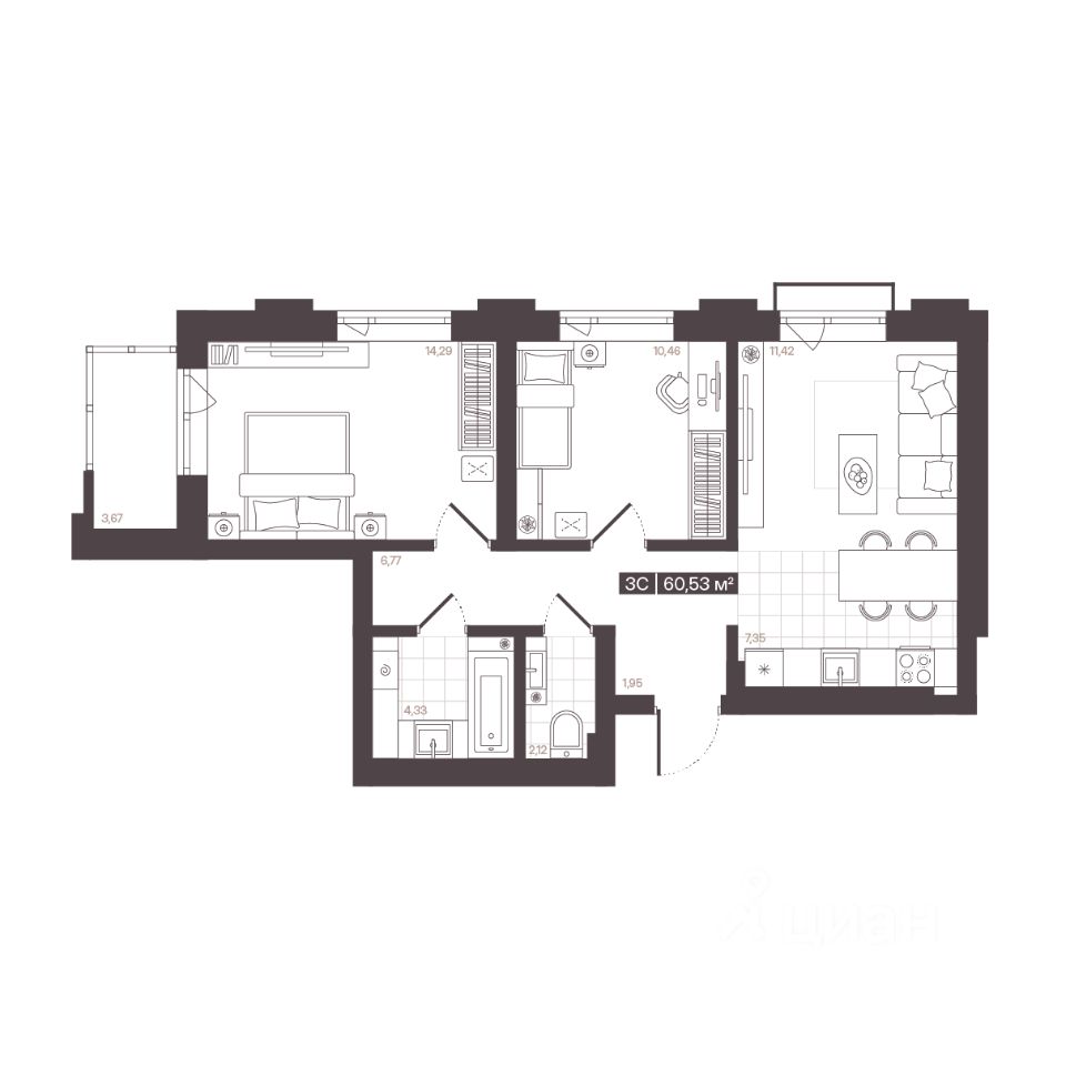 Продаётся 3-комнатная квартира в строящемся доме (Корпус 1 (БС 4-6)), срок сдачи: I-кв. 2028, общей площадью 60.53 кв.м., на 9 этаже. В рамках программы КРТ будет реализован жилой квартал "Моне". Строительство объекта будет осуществляться в 4 очереди, а общий срок реализации проекта составит около 10 лет. Также в проекте запланировано строительство детского сада.