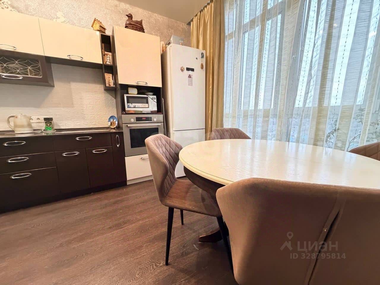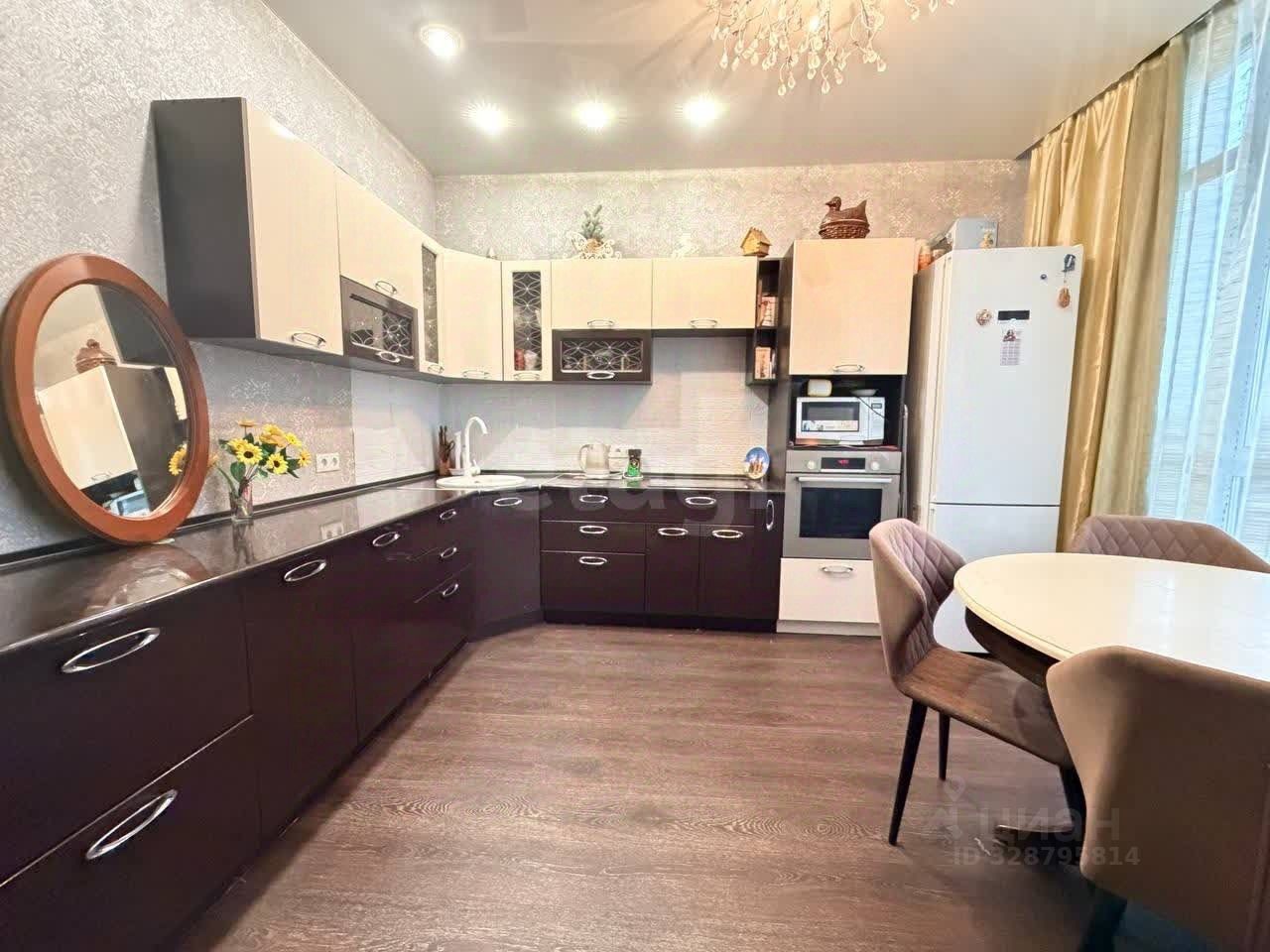 Просторная кухня-гостиная оснащена встроенной техникой и обеденной зоной. Санузел совмещённый, в прихожей установлены вместительные шкафы.