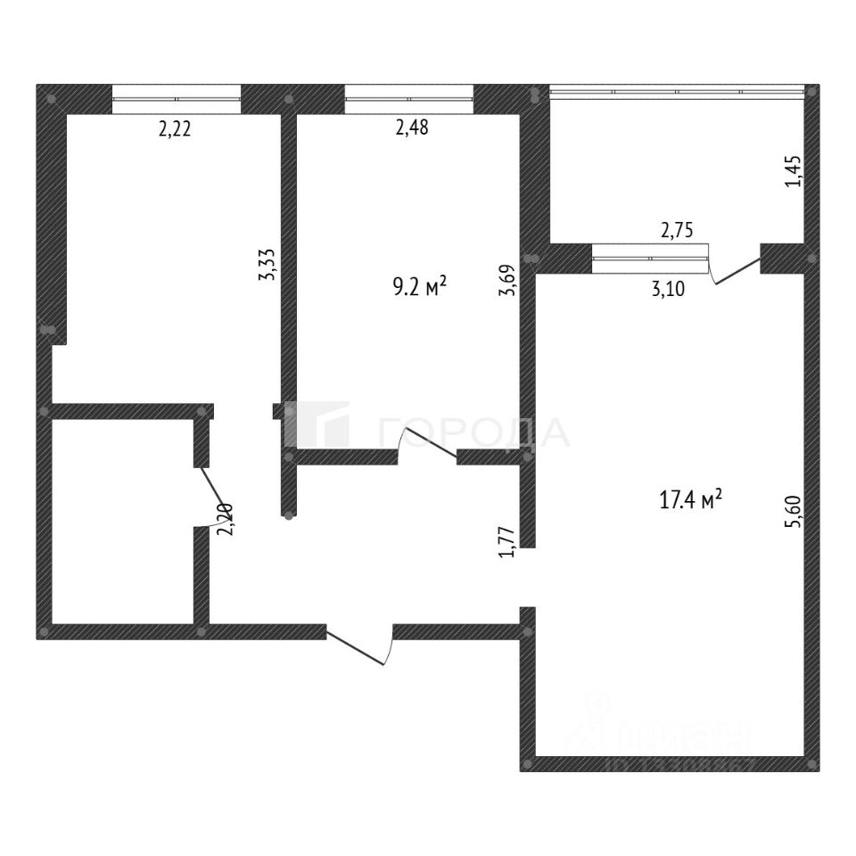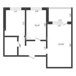 Квартира расположена на 5 этаже 9-этажного панельного дома 1977 года постройки. Общая площадь составляет 43,4 кв. м, из которых 26,6 кв. м — жилая площадь. Две изолированные комнаты с площадями 17,4 кв. м и 9,2 кв. м, кухня — 7,4 кв. м. Высота потолков — 2,5 м.
