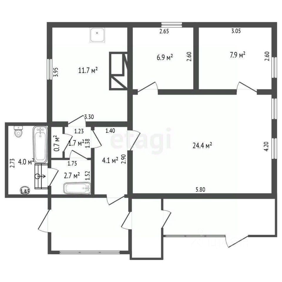 Дом площадью 69,1 кв. м расположен вблизи центра города, что обеспечивает удобную транспортную доступность и развитую инфраструктуру. Объект находится в шаговой доступности от школы 3, спортивных объектов и магазинов, что делает его привлекательным для семей с детьми. Дом состоит из трех комнат, кухни и санузла, все помещения содержатся в хорошем состоянии. Полы, стены и потолки ровные: в одной из спален установлен натяжной потолок, в другой — гипсокартон с обоями, в остальных помещениях — потолочная плитка. На полу уложен линолеум, лаги прочные, скрип отсутствует. Окна пластиковые, межкомнатные двери раздвижные, что добавляет удобства в эксплуатации.