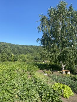 Дом огорожен деревьями с улицы, на участке новый забор, есть 2 теплицы из поликарбоната. 3 больших разделенных огорода - один для картошки, другой для овощей/ягод, третий для цветов. Участок ухоженный.