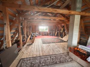На первом этаже расположены три просторные комнаты, лестница ведет на второй этаж, где можно обустроить дополнительные спальни или зону отдыха.