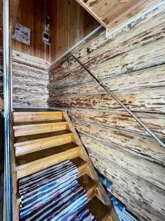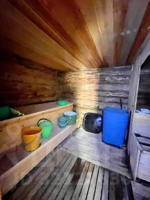 Внутри: обшита вагонкой, деревянные решётки на полу, просторное помещение.
