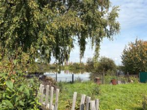 Участок ровный, расположен в тупике, что скрывает участок от посторонних глаз. В конце участка видно пруд, где можно рыбачить, кататься зимой на коньках.