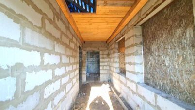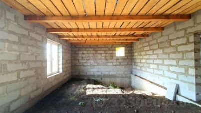 На текущем этапе уже выполнены ключевые работы: подсыпка под бетонный пол, установлены пластиковые окна и смонтирована стропильная система крыши с обрешеткой, что позволяет новому владельцу сосредоточиться на внутренней отделке по своему вкусу.