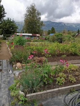 Садовый участок расположен у подножья горы "Зелёная". Постройки - дом из бруса 5 х 6м, летняя кухня, баня, туалет, теплица - поликарбонат на фундаменте из бруса 3 х 8м, гряды высота 0,30х 1х 8м в коробах из доски 0,15х0,040м. Центральные дорожки выложены природным камнем. Насаждения декоративные: кедр -возраст 55 лет, урожай чистого ореха 2 ведра, дубы - возраст 35 лет; сирень -белая, сиреневая; спирея розовая, снежно-ягодник. Кустарники плодовые - малина 20 кустов, смородина черная 8 кустов, смродина красная 2 куста, йошта, барбарис красный классический, облепиха, айва 2 куста, калина, жимолость, яблоня. Многолетние цветы 50 видов.