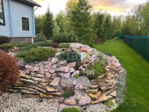 Ландшафтный дизайн. Участок очень зеленый , рулонный газон с системой автоматического полива, футбольное поле, зона воркаут + беговая дорожка 90 м. Много хвойных деревьев и кустарников .