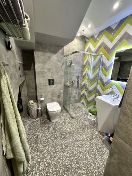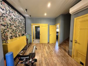Регулируемые водяные теплые полы с индивидуальной настройкой температуры в комнатах, приточная вентиляция, четыре кондиционера (холод/тепло) плюс один мощный на первом этаже. Шумоизоляция смежной стены, умное освещение с точечными светильниками и RGB-подсветкой, сигнализация с тревожной кнопкой и онлайн-камеры на террасе и участке.