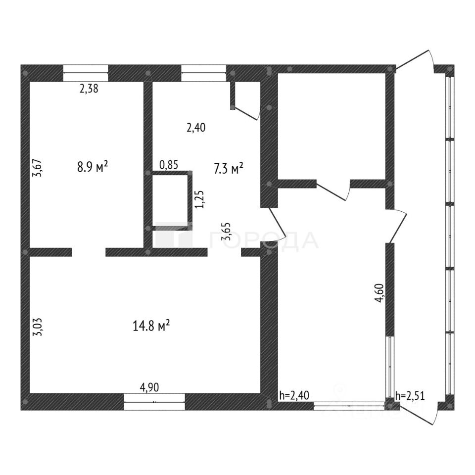 Общая площадь дома 33 кв.м, из которых 23,6 кв. м — жилая площадь. Дом состоит из двух комнат, площадью 8,9 кв. м и 14,7 кв. м, и кухни площадью 7 кв. м. На участке площадью 8,5 соток есть гараж и баня.