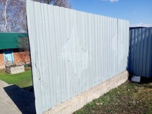 Забор из профлиста на ровном бетонном фундаменте.
