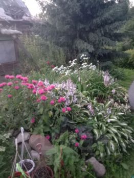 На участке много хвойных деревьев, кустарников.