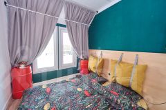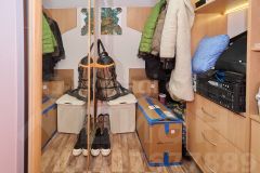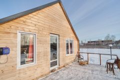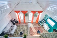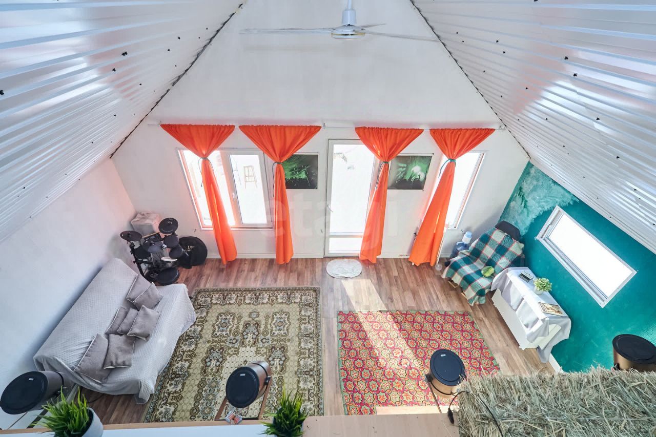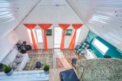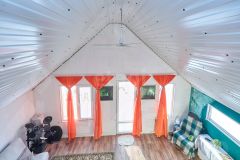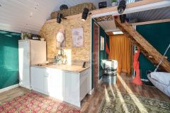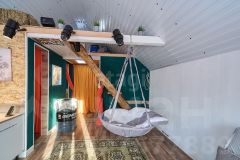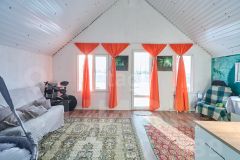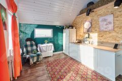 Внутри всё оборудовано для комфортного проживания: просторная кухня-гостиная, оснащённая необходимой мебелью и бытовой техникой, тёплая светлая спальня, удобная гардеробная комната для хранения вещей. Система отопления представлена эффективными электрическими конвекторами, пол покрыт ламинатом, установлено современное вытяжное устройство для вентиляции помещений.