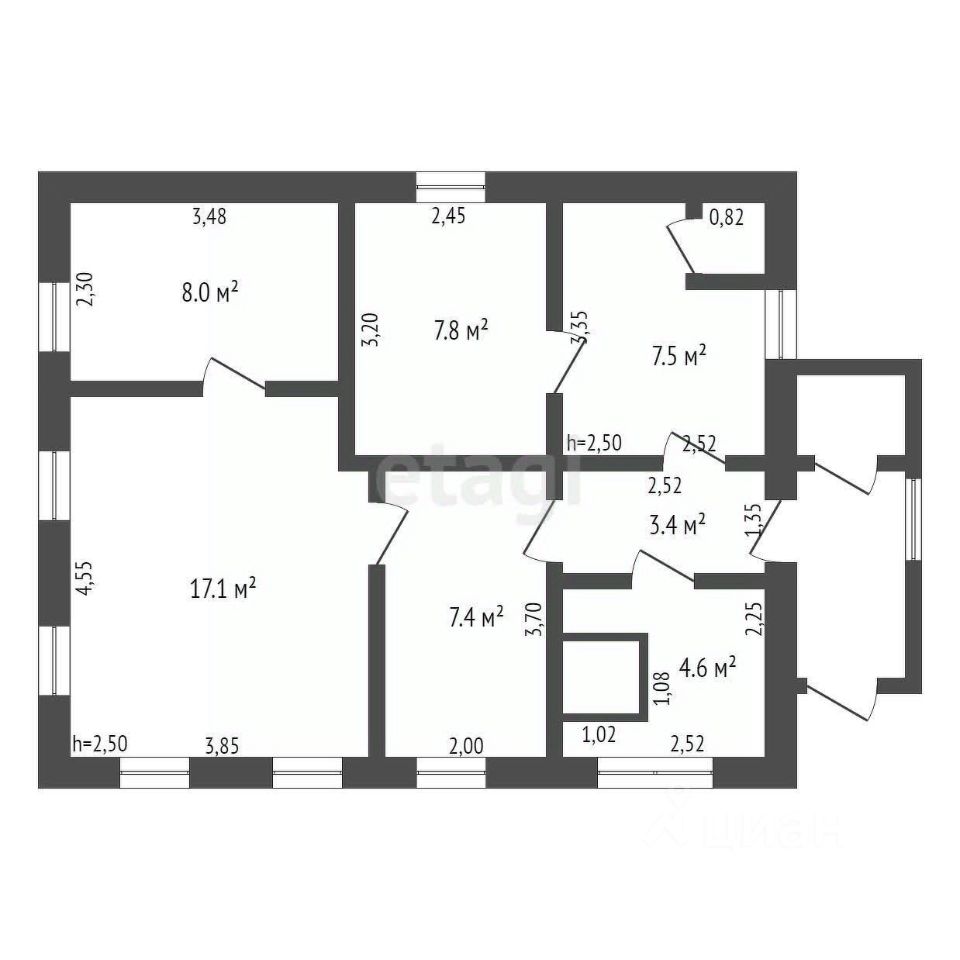 В доме 5 комнат: 17.1 кв.м, 8,0 кв.м., 7,8кв.м., 7,4 кв.м, 7,5 кухня 4,6 кв.м.. Есть Возможность увеличить кухню до 15.4кв.м., объединив помещения 5, 6 и 7. А так же сделать полноценный санузел, используя помещение 1.