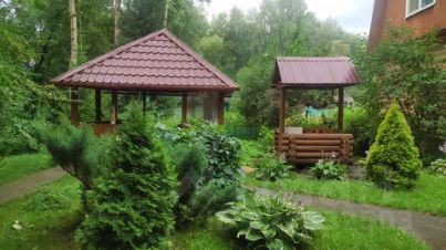 Отдельно расположена беседка с летней кухней, большим столом и скамьями.