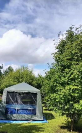 На лето ставится каркасный бассейн. Деревянный подиум . Место хорошо освещается солнцем, быстро греется вода.