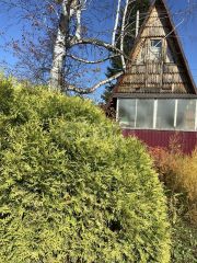 Участок облагорожен взрослыми деревьями и кустарниками, создающими тень и уединение.