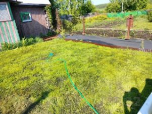 Участок — настоящая гордость: посажен газон, есть клумба с хвойными. Ягодное изобилие: смородина, ирга, крыжовник, малина, виктория. Есть место и для грядок, а также большая теплица — для тех, кто любит свой урожай.