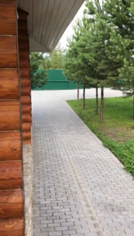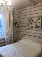 Дом построен из оцилиндрованного бревна d-26 см., 60 кв.м., высота потолков 3 м. Фундамент: усиленная плита на буронабивных сваях. Крыша покрыта металлочерепицей. К дому примыкает терраса 9х2,5 с брашированным ограждением, на полу террасная доска (лиственница), проведен свет. В доме в гостевой зоне, витражные окна. Основная площадь пола, покрыта пробковой плиткой, в коридоре, с/у и кухонной зоне керамическая плитка.