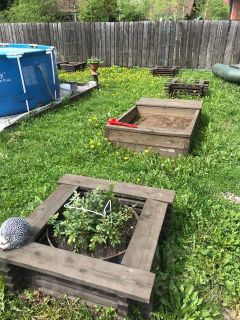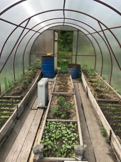 Небольшой огородик из нескольких локальных грядок и теплицей 3х6, стайка, железный гараж (хозблок)4х4 из металлпрофиля.