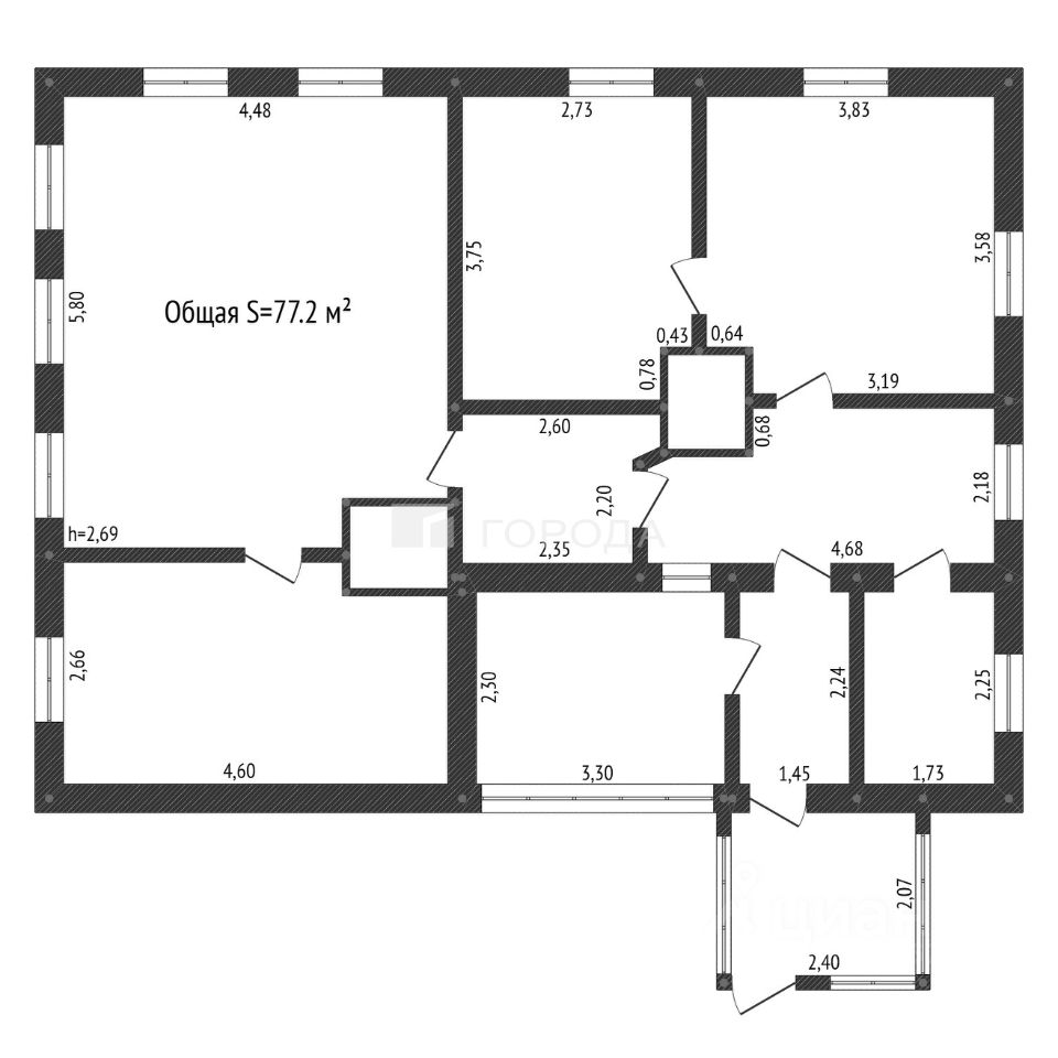 Общая площадь по документам 77,2 кв. м, но фактически площадь дома составляет 95,2 кв. м (проводятся кадастровые работы по уточнению площади дома).