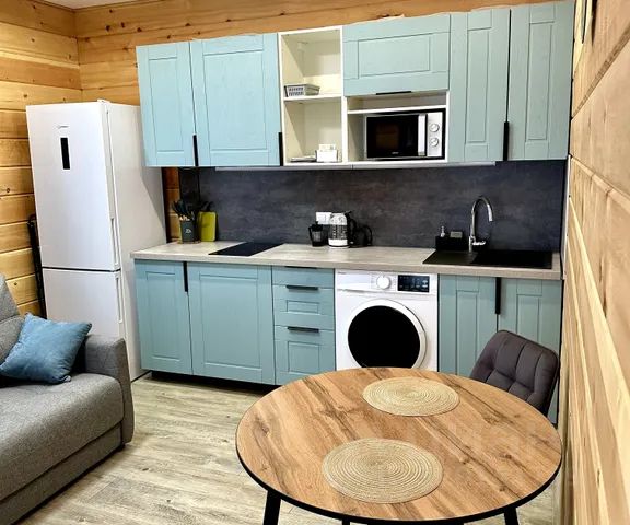 Номер-студия включает в себя кухонную зону совмещенную с гостиной (отдельная спальня отсутствует) и санузел с душевой. В номере диван-кровать на два гостя Из удобств в номере: Кухонная плита Холодильник Микроволновая печь Набор посуды и столовых приборов WI-FI Стиральная машина Телевизор Фен Дополнительно в гостевом доме для Вас : сушильная комната для инвентаря (общая) мангал (бесплатно) парковка