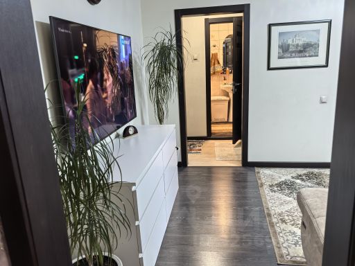 Зал: удобный мягкий диван, раскладывается в двуспальное место, стеклянный круглый журнальный стол, телевизор, шкаф-стеллаж, балкон.