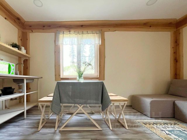 Комната 1- гостиная, в которой размещена кухонная зона, круглый обеденный стол ручной работы, два кресла (с возможностью разложить).