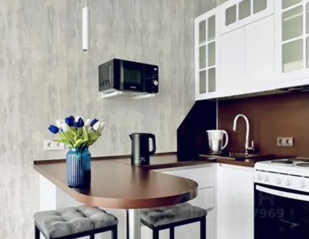 Микроволновка, печь, чайник с выбором температуры, холодильник, кухонный гарнитур с барной стойкой, барные стулья, набор посуды для приготовления и приема пищи, столовые приборы, кухонное полотенце, салфетки, чай, кофе, сахар, соль.