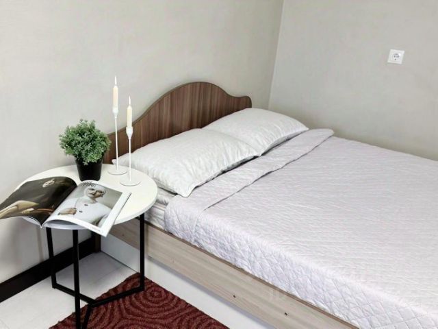 Спальня: Мягкая двуспальная кровать с прикроватной тумбой, вместительный шкаф и элегантный туалетный столик с зеркалом — идеально для утренних сборов!